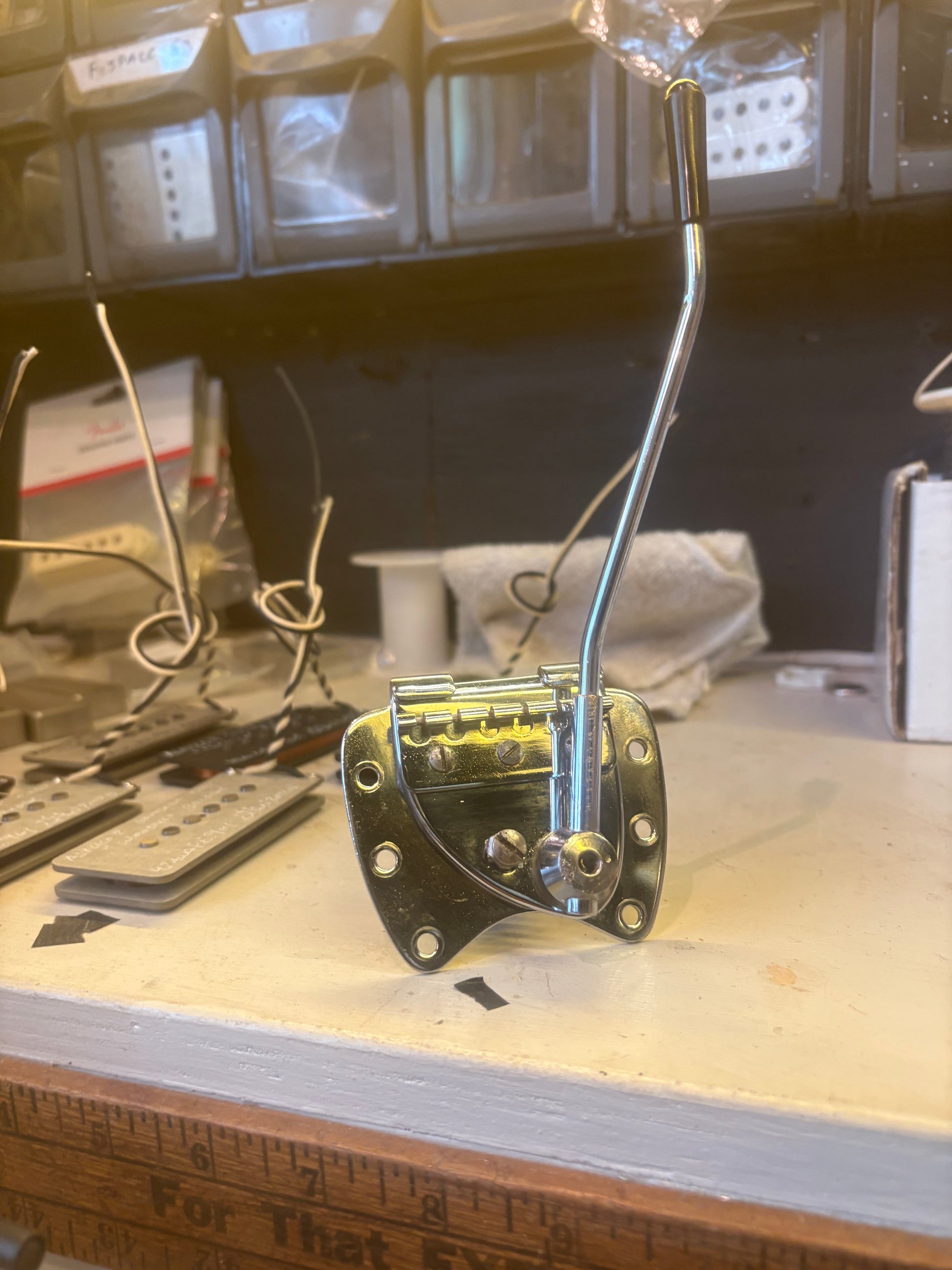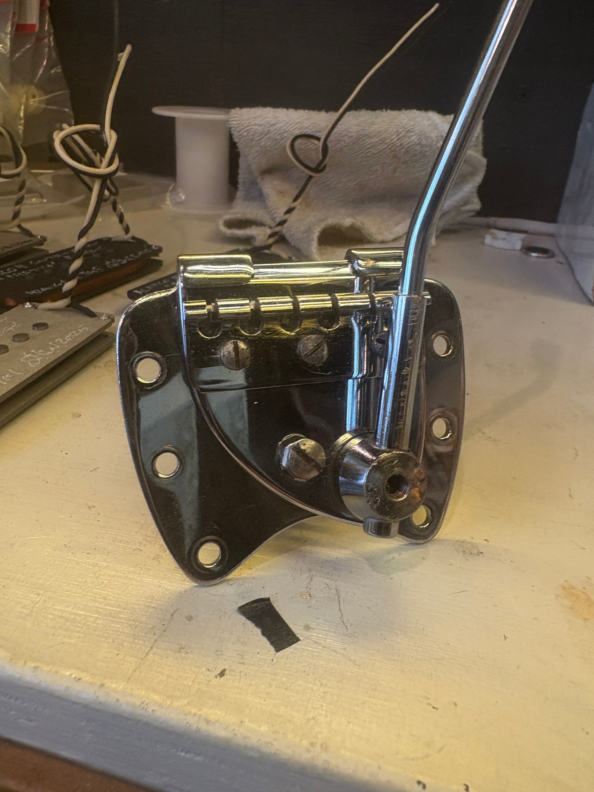 I have cleaned it up and removed the surface rust and grime with white vinegar, gently polished it and lubed everything with light machine oil. These have a little less range up and down than a Bigsby or Jazzmaster, sometimes you have to fool around swapping springs to get it to rest real flat and feel nice too depending on string gauge. Same as a Bigsby there really. Missing the set screw that holds the arm tight in place but it fits and stays snug in its pipe, you may find you don’t need to source one. Great easy to implement vintage trem. Put it on a Squier Tele!!!