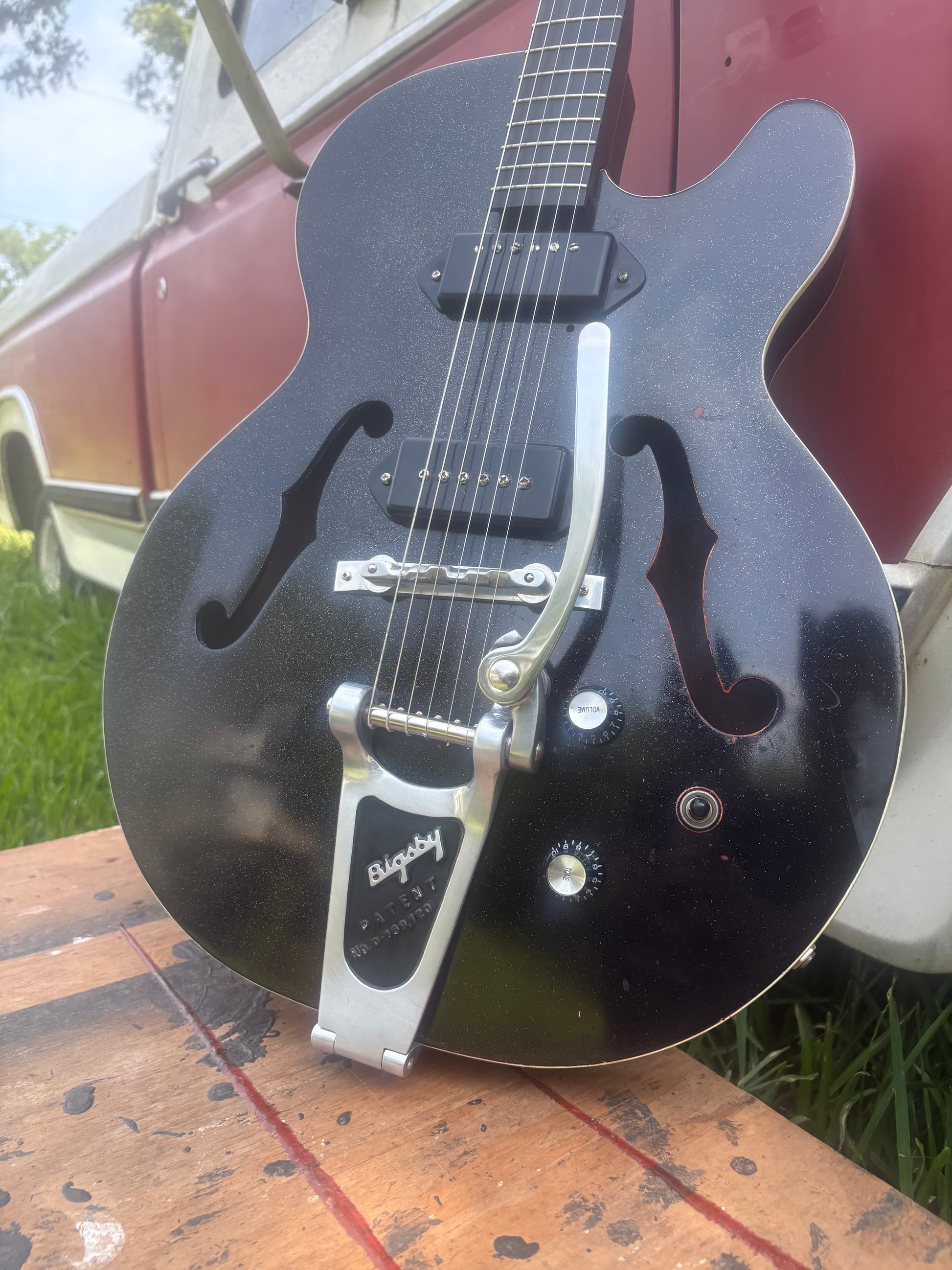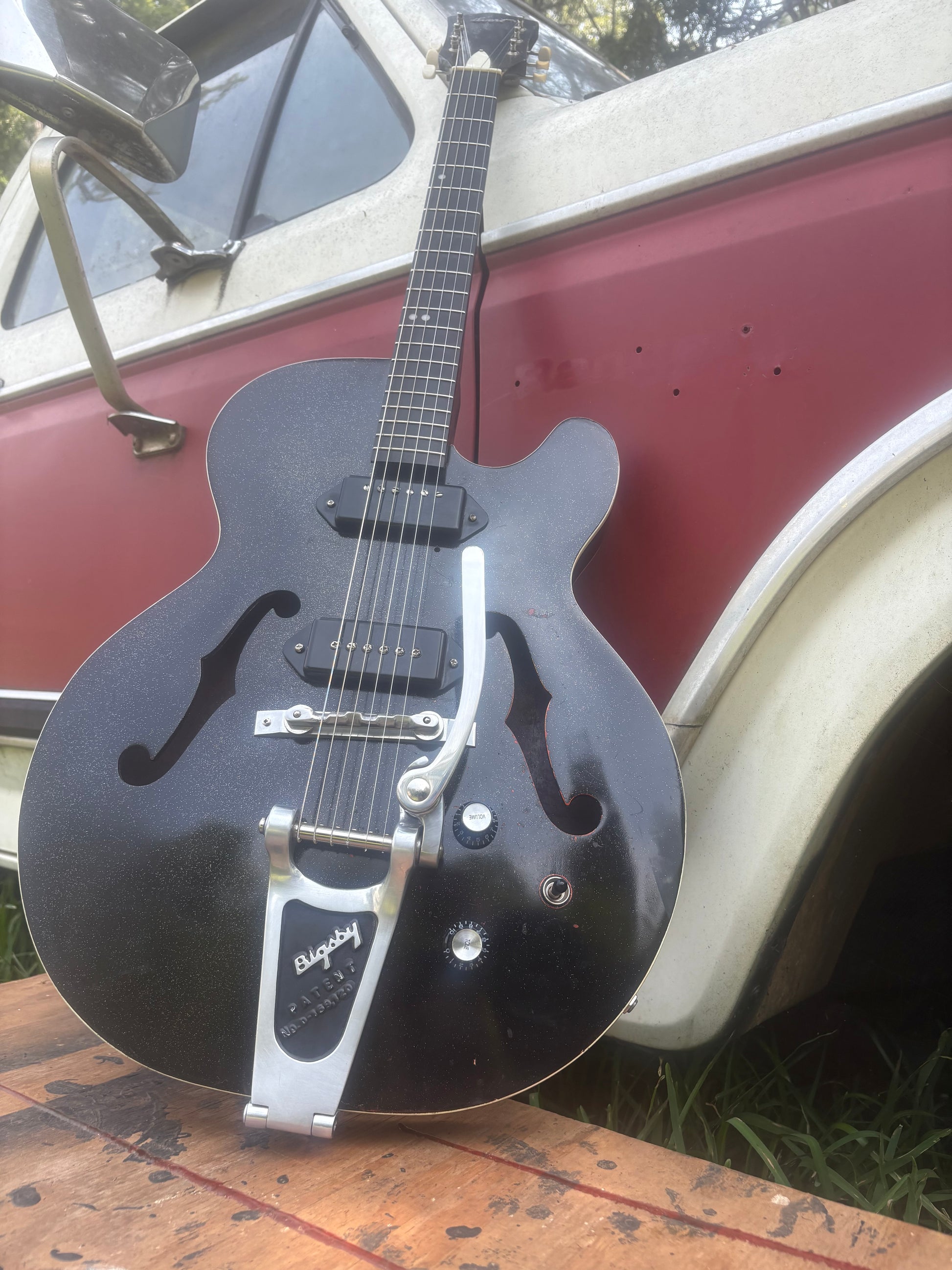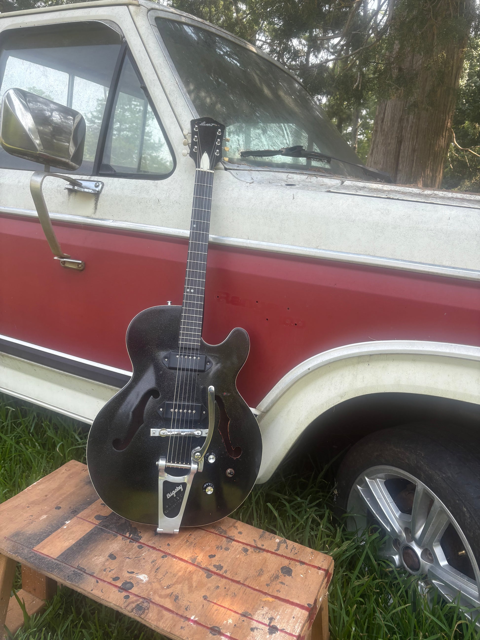 i got it before dead/affordable goldfoils were a thing, kind of right at the Jack White into Black Keys peak. I cut it for dogear P-90’s and eventually widened the neck route a little to accommodate the 6k7 Alnico 4 PAF under dogear cover. Bridge pickup is a nice grease and grit Alnico 4 P-90/Mosrite hybrid deal, big phillips head 6-32 pole pieces.