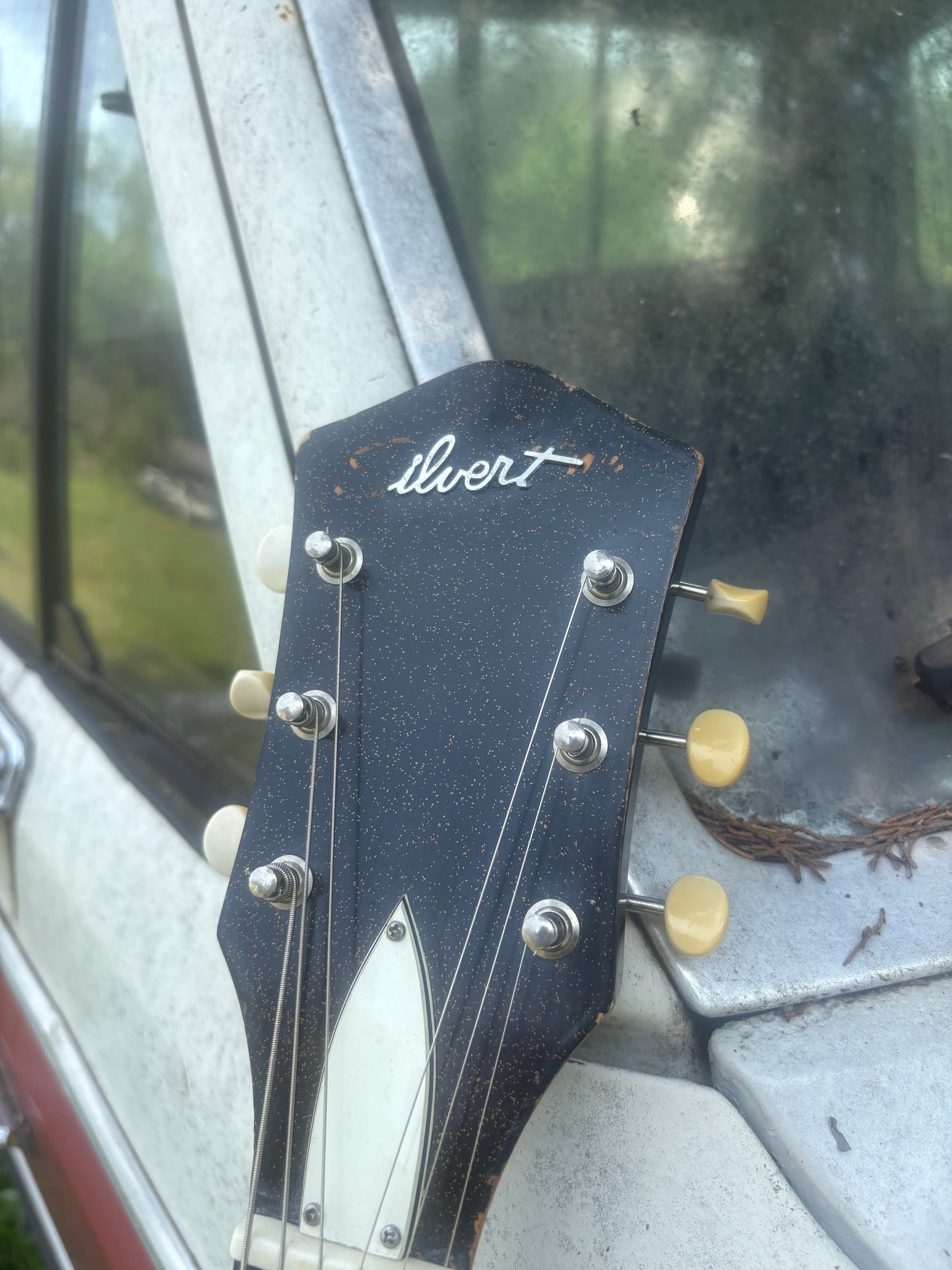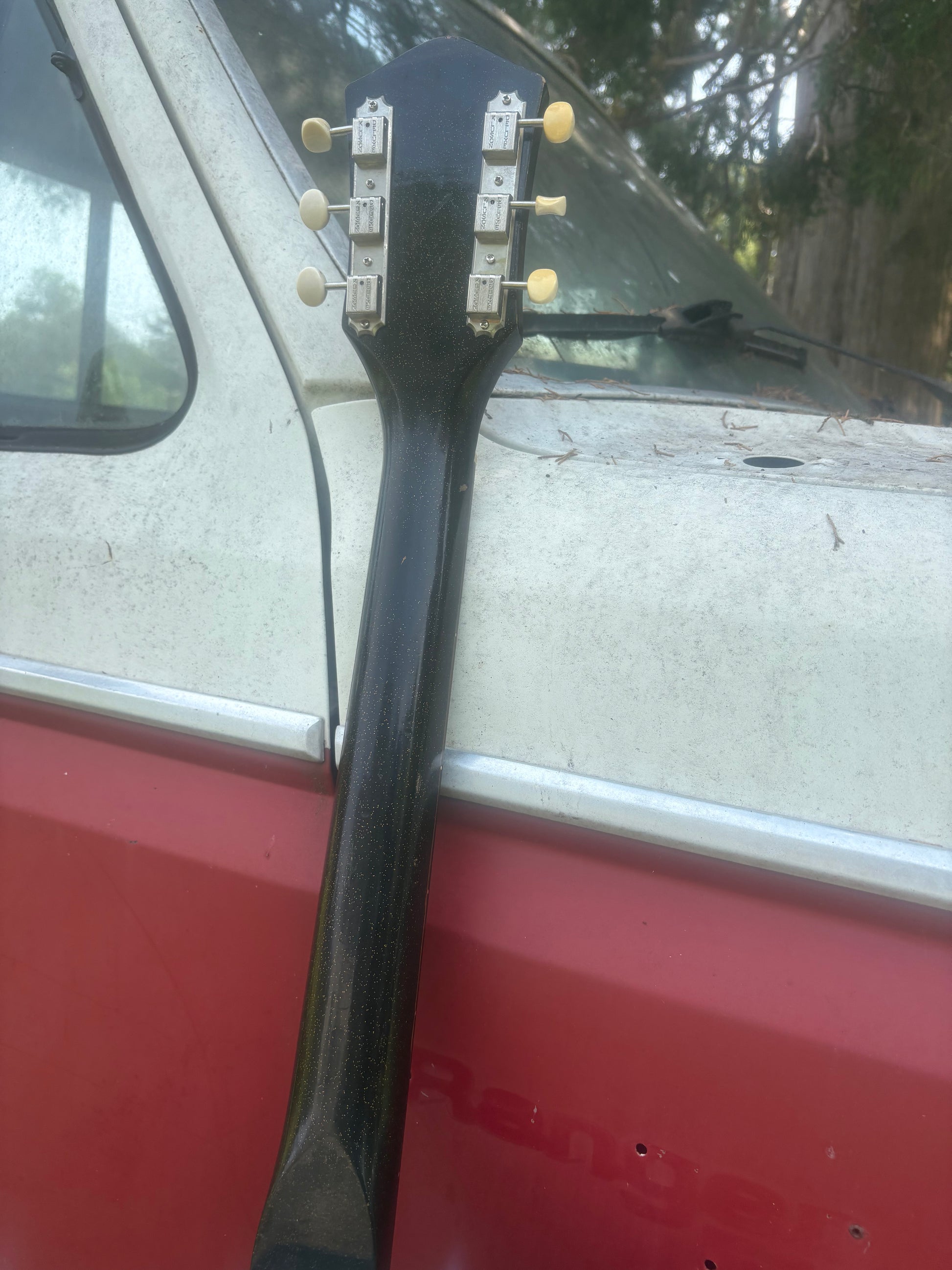 60’s Silvertone 1446 neck, resprayed Harmony Rocket body. I got this maybe 15 years ago off Con-Tiki on the Offset Guitars forum. He replaced the rosewood fretboard with an excellent 9.5” radius slab of lightly grained ebony with 25.5” scale. Neato brass side dot markers, minimalist fretboard markers at 5th and 12th.
