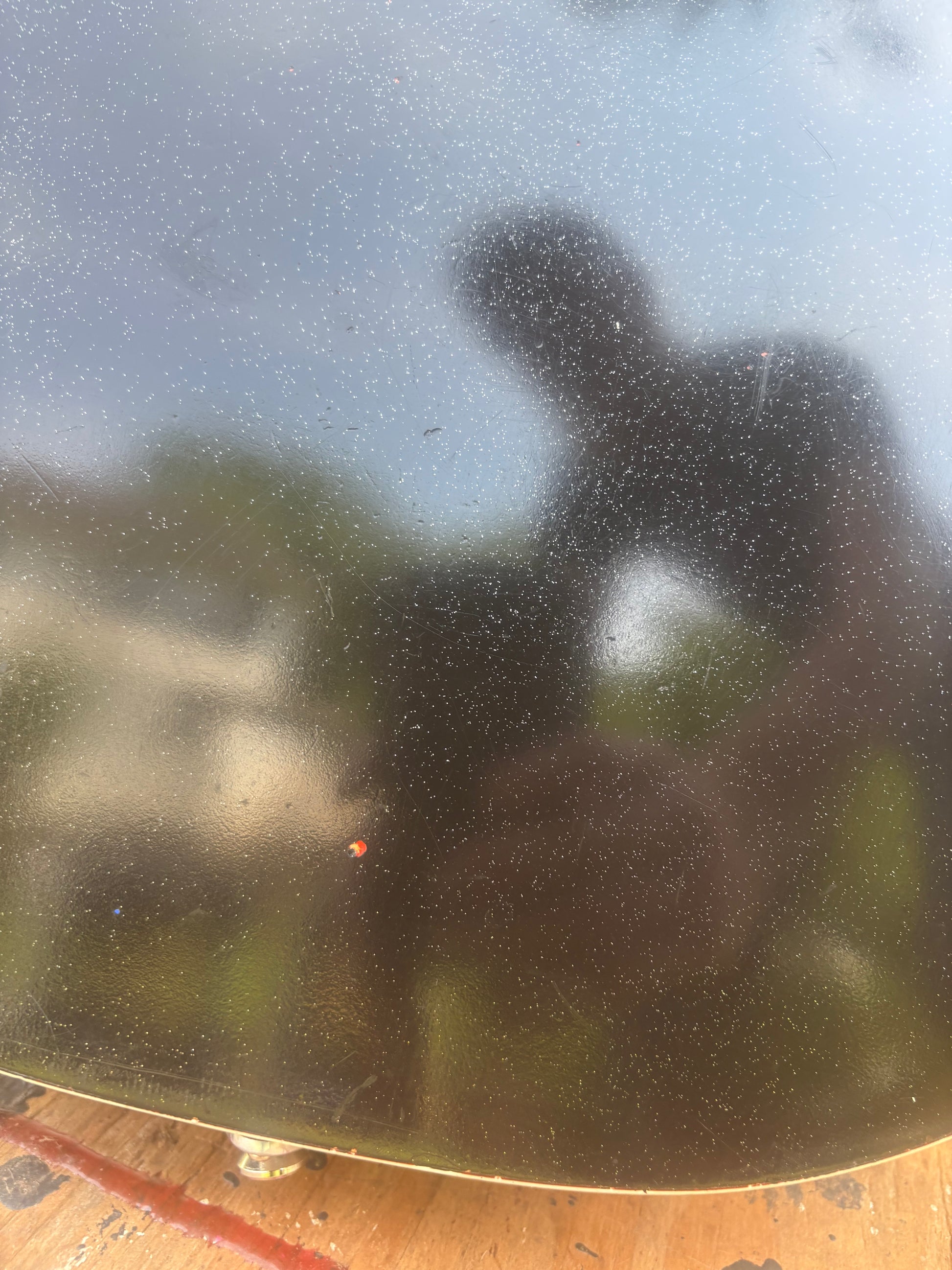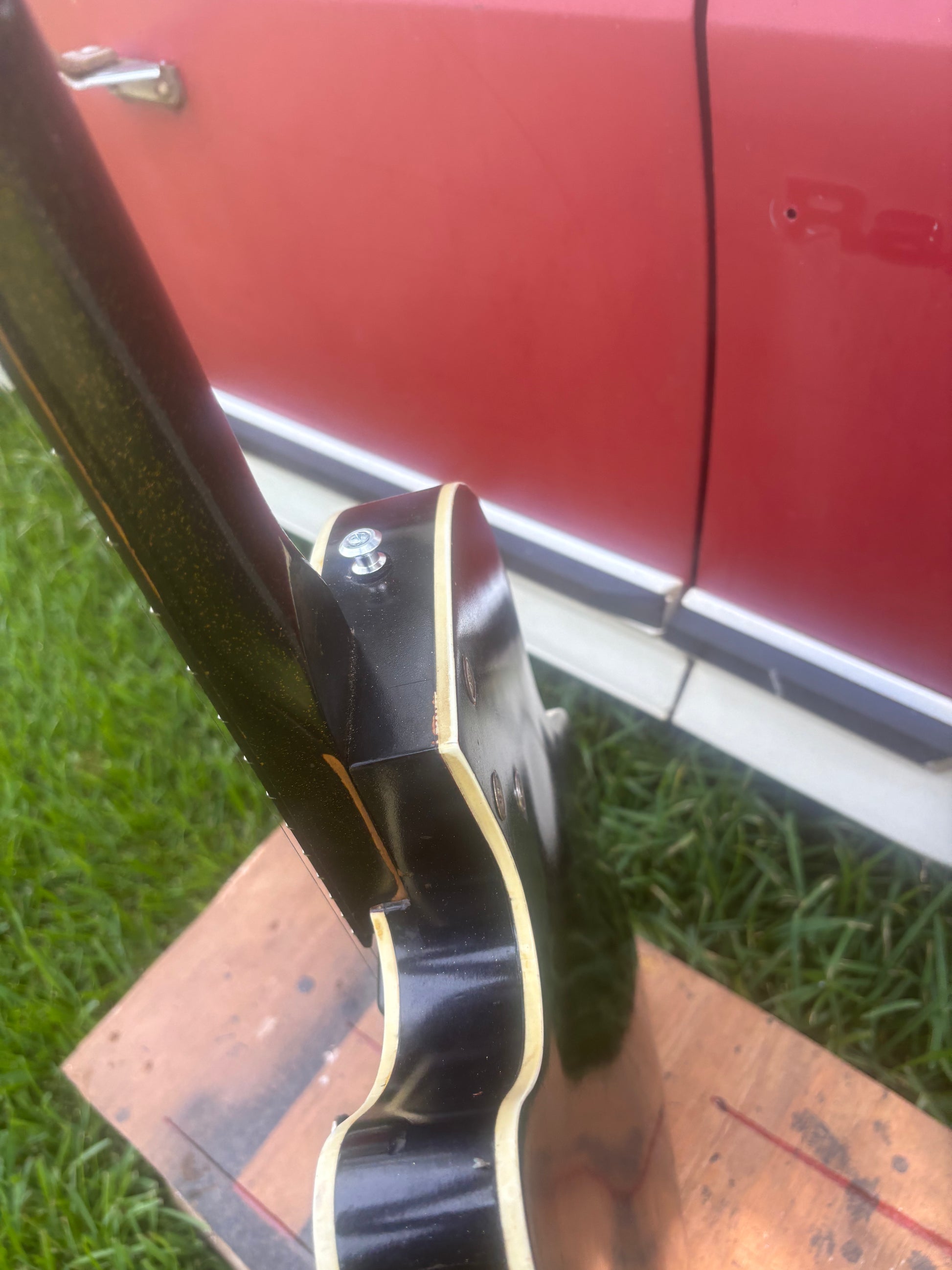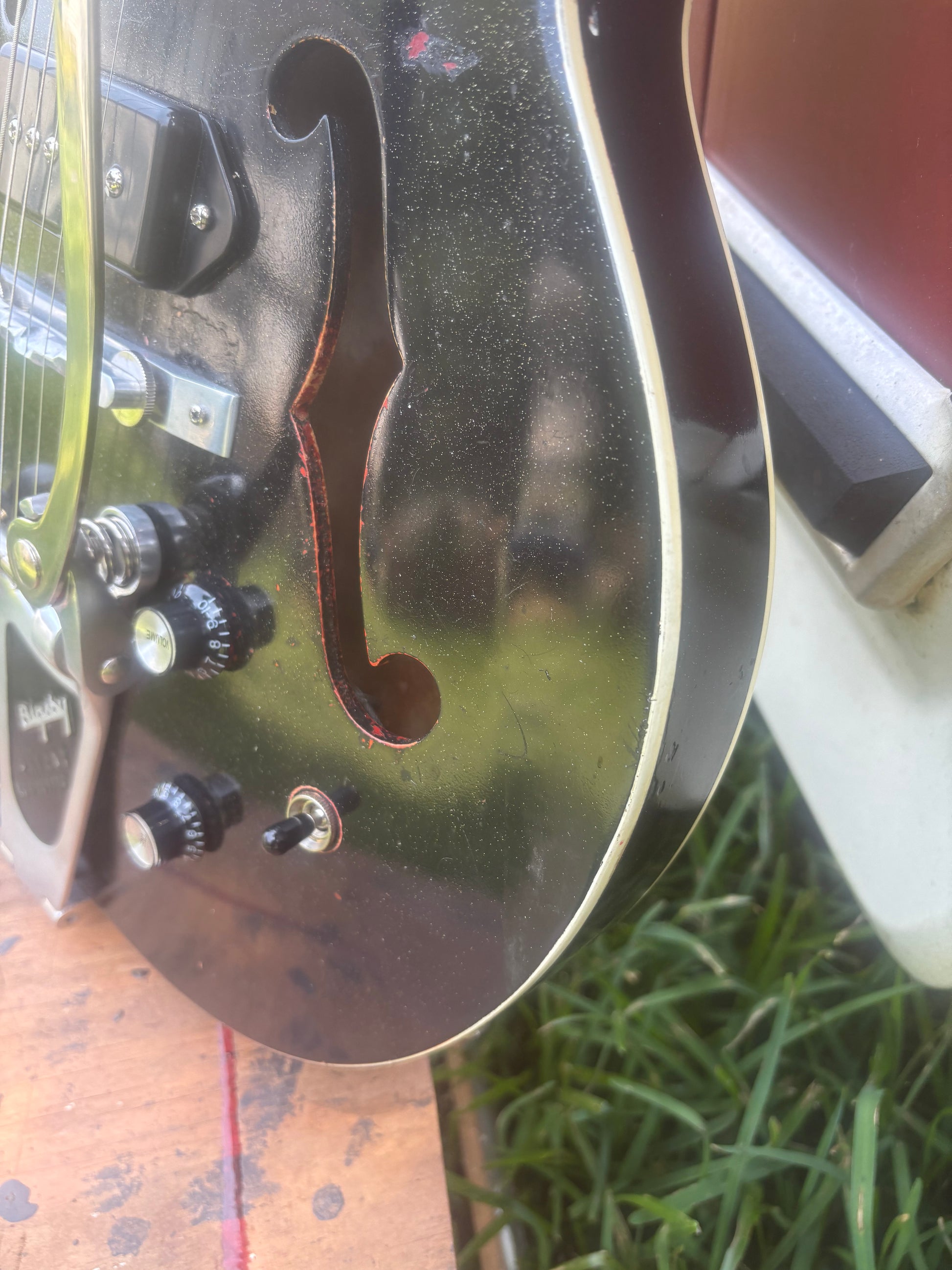 It had been cut earlier in its life for a PAF in the neck position, but patched when it was sprayed a close black sparkle to the 1446, but not quite a perfect match. Lots of f-hole wear reveals the Rocket cherry burst under the black.