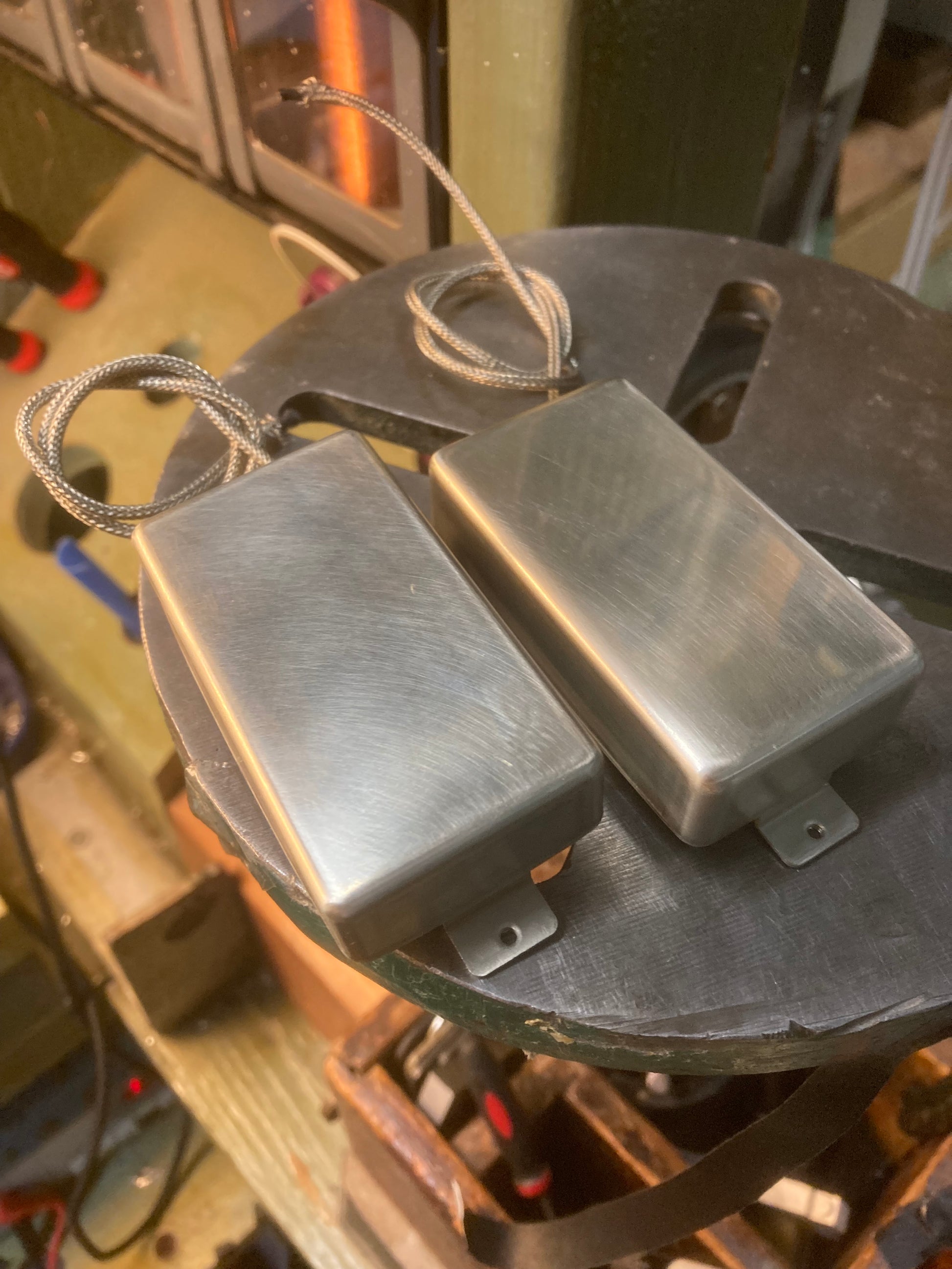 All share the same vintage spec Firebird bobbins and vertical bar magnets. These are available in graduated output levels from vintage to hotter. My preferred hotter specs use a thicker steel plate under the bobbins to couple the coils. These thicker plates keep the overall output level about the same as vintage and while working with the slightly hotter coils to fatten up the mids, sweeten the treble, and get a little more snap and spank in the bass. Priced individually to mix and match.
