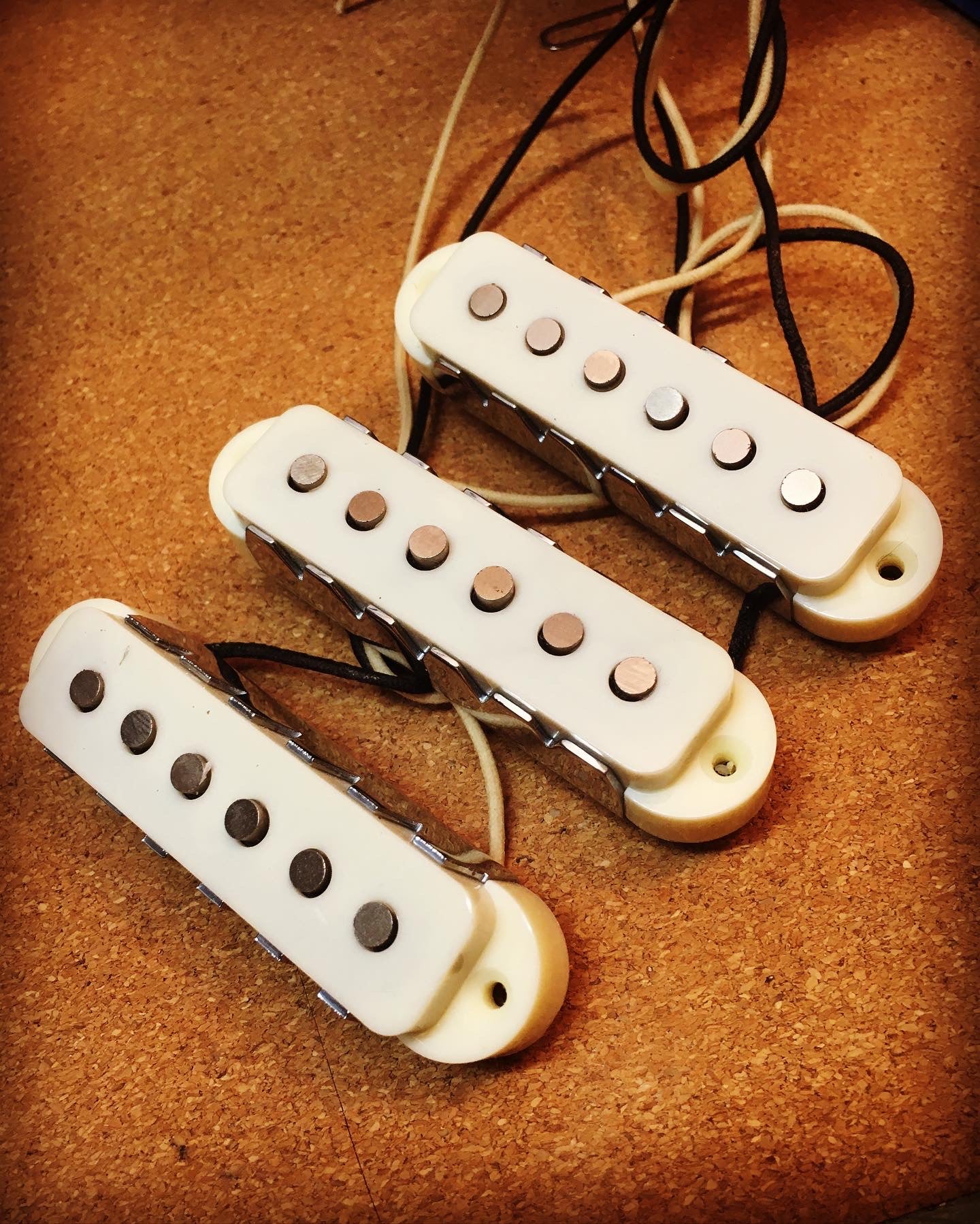 The combination of slightly shorter/weaker magnets and a little more coil means the output is only a little stronger than an Alnico 5 straight vintage set, but the voicing has that throaty sound, like the difference between a Tele and a Broadcaster bridge, and some extra fatness in the middle and bridge. Super fun set.